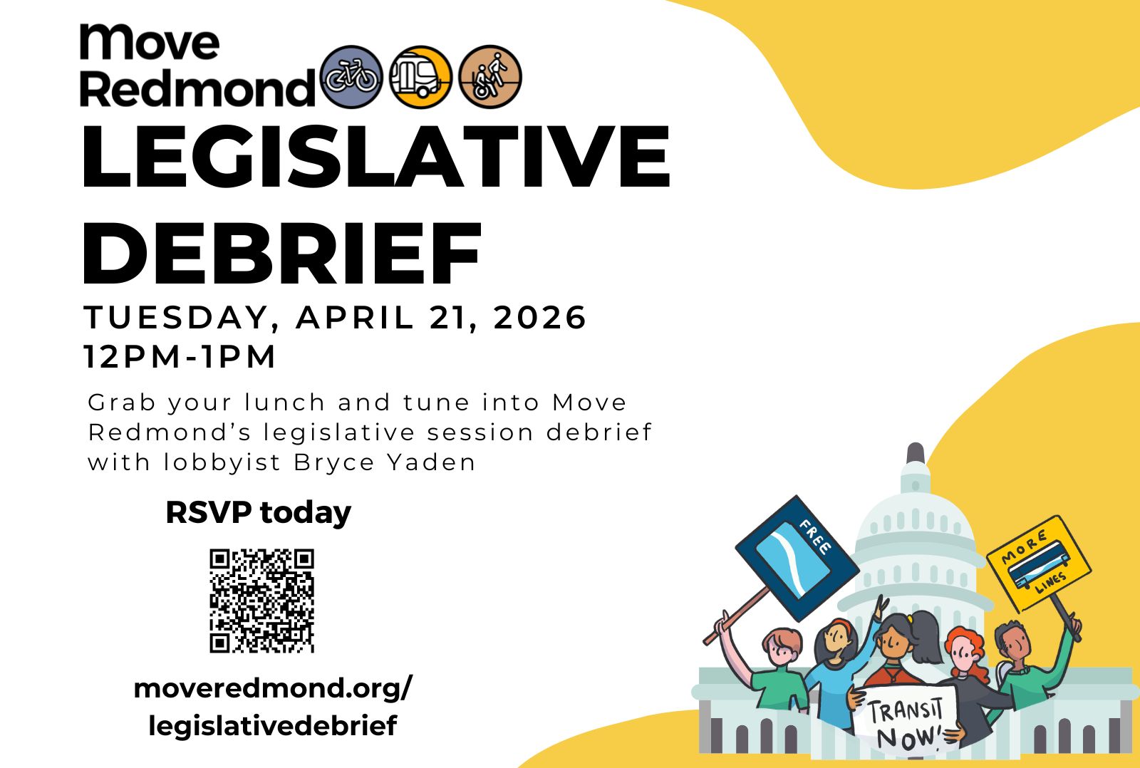 Grab your lunch and tune into Move Redmond’s legislative session debrief with lobbyist Bryce Yaden. This session will cover what happened with HB 2307 on Commute Trip Reduction and funding for that program.