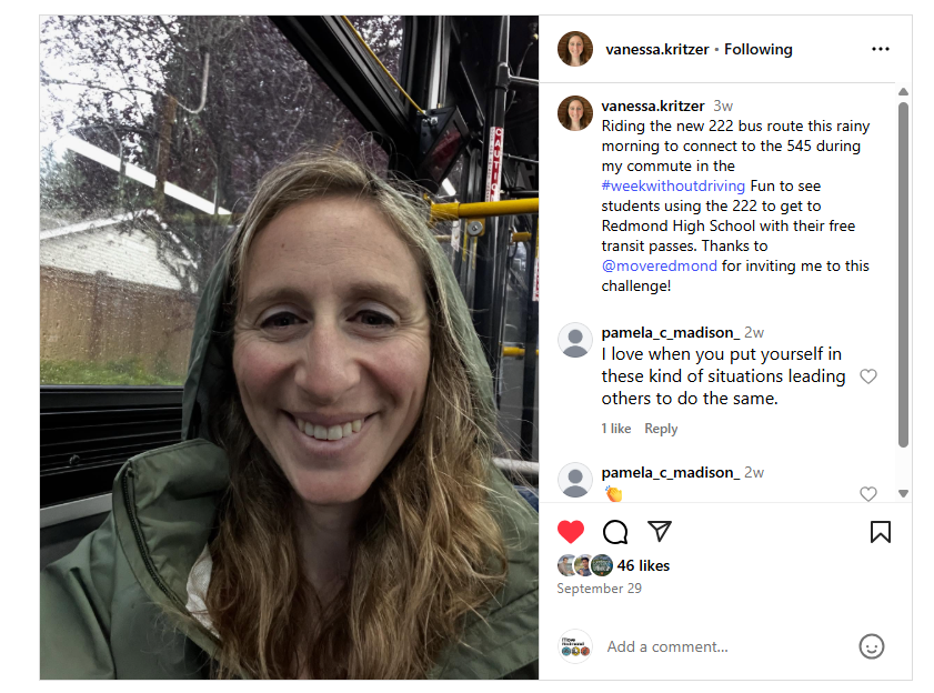 Councilmember Angie Nuevacamina agreed to participate in the Week Without Driving Challenge but has not shared reflections to Move Redmond.